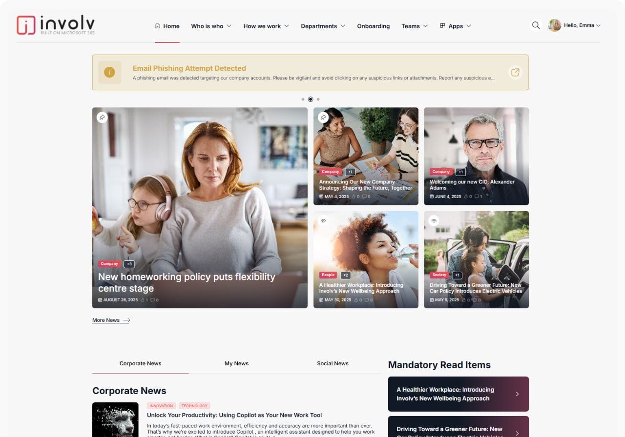 Involv is a Microsoft 365-based intranet built on top of SharePoint. It’s designed to eliminate the technical complexity of SharePoint by offering a set of over 60 prebuilt components – such as news, onboarding, people directories, events, alerts and policies – that can be deployed quickly without code or IT support.