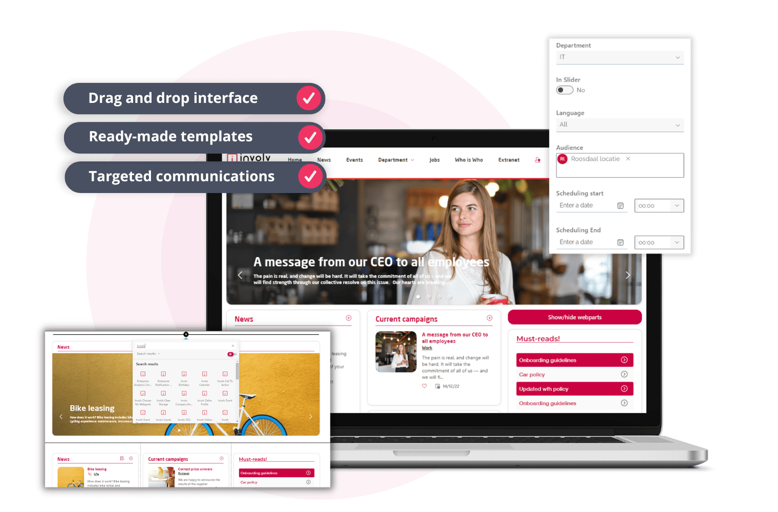 An intranet CMS with an intuitive design like Involv makes it much easier and faster for intranet admins and content creators to create and publish news, events and pages. Using the drop and drag builder, you can add any type of content you like: text, images, video’s and any other widget. Involv’s targeting and personalizing capacities enable you to deliver the right message to the right people.