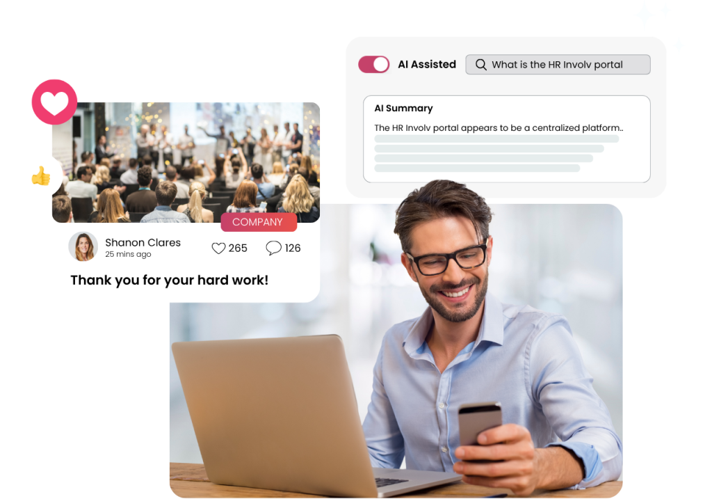 Involv maakt het eenvoudig om samen te werken over teams en locaties heen. Met een people directory, organigram, uitgebreide profielen, verjaardagen, new hires en ideation bouw je sterkere relaties en blijft iedereen betrokken – vanaf dag één.
