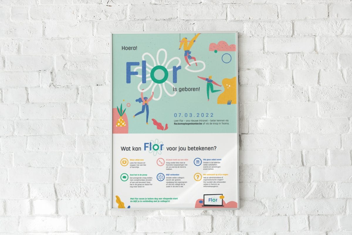 Het communicatieteam van Kom op tegen Kanker heeft fantastisch werk geleverd. Ze maakten geboortekaartjes en een poster. Daarop kondigden ze de naam van het pasgeboren intranet aan, de lanceringsdatum en 9 redenen waarom Flor iedereen binnen de organisatie zal helpen om het meeste uit hun werkdag te halen.